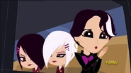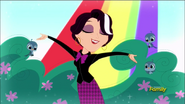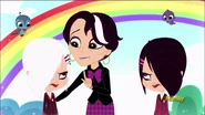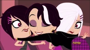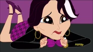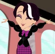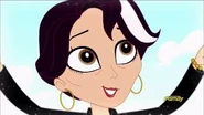 Eliza has black hair with a streak of white in it. She also has brown eyes.