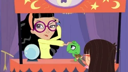 Mrs. Twombly leads the psychic into the day camp room and asks about the regulars. The psychic labels all of the pets as the exact opposite of their actual personalities and tells Mrs. Twombly that the spiky thing (Russell) requests to make the room messier. Mrs. Twombly furiously jots down notes as Russell, overhearing the psychic, becomes confused. Among the psychic's observations is that Zoe hates getting dressed up, so Mrs. Twombly removes Zoe's signature beret, causing her to cower in embarrassment. Mrs. Twombly is so pleased with the psychic that she asks for her to work in the Littlest Pet Shop in her own section. The psychic happily obliges, retrieving all of the necessary items from her car as the pets look on concerned.